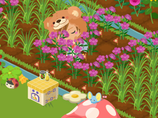 収穫の模様がこちら。作物を収穫するとこのように…アイコンがポコッと出ます。緑のアイコンは集めていくとお庭のレベルが上がっていくものです。収穫のときに、ライフコインという仮想通貨も手に入ります。