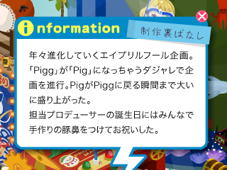 エイプリルフールの企画は管理人も楽しみにしていましたemoji 今年はピグちゃんが大きくなるのかな、小さくなるのかな、とか気になるんですよね笑。ピグちゃんが豚emojiになったこともありましたねぇ、ロボットemojiになったこともあったようなemoji