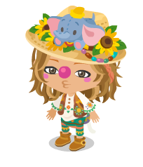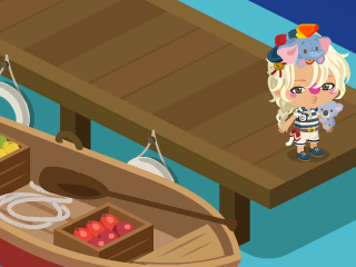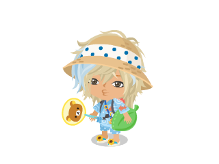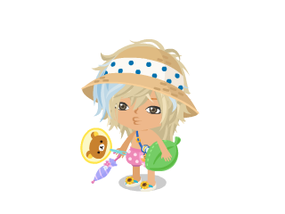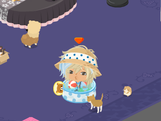 ここはピグのお部屋です。ミニプールに着衣のままで浸かっています。よほど暑かったのでしょう。この帽子、なかなか可愛いですね。麦藁帽子って好きなんですよね~。