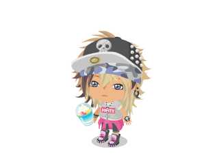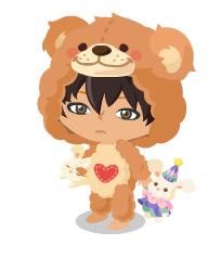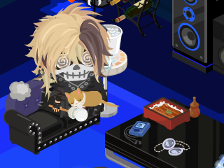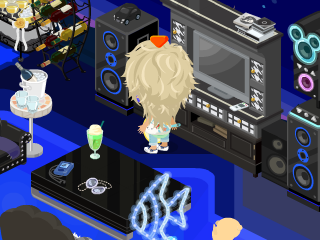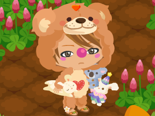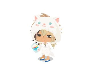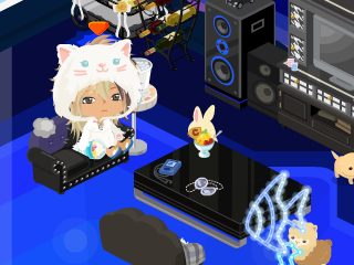 ピグのお部屋にて。これは…ゼリーでしょうか?今回の食べ物アイテムです。ソファーがボロだ笑。綿がでてきていますね。猫の着ぐるみを着たピグちゃんは可愛いですねぇ