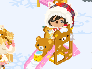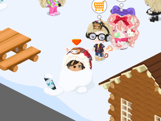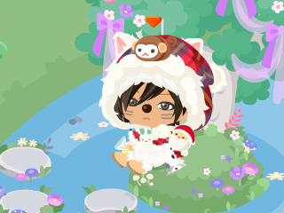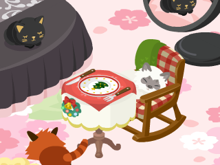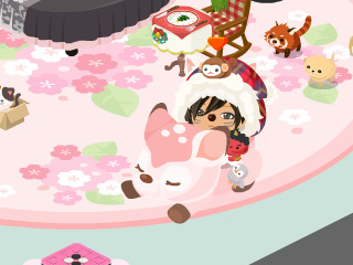 これ、どうやるかというと、まずはピグを普通に椅子に座らせます。次にペットをひざに乗せます。そしてピグちゃんだけ椅子から離れれば…ペットが椅子で寝ているように見せることができます。