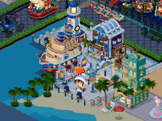 港をイメージして作った一画です。浜辺もタイルを敷き詰めて作りました。だいぶ手をかけた場所なので思い入れは深いです。