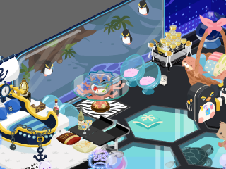1階のお部屋の中の様子。この頃は壁紙をペンギンにしていますね~。ペンギンの冷蔵庫もあります。ほとんど釣りアイテムですね。