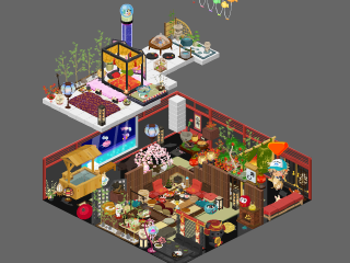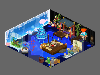 そしてこちらがこの頃の2階の様子。壁紙が水槽になっています。囲炉裏はお気に入りなので改装してませんね。2階は