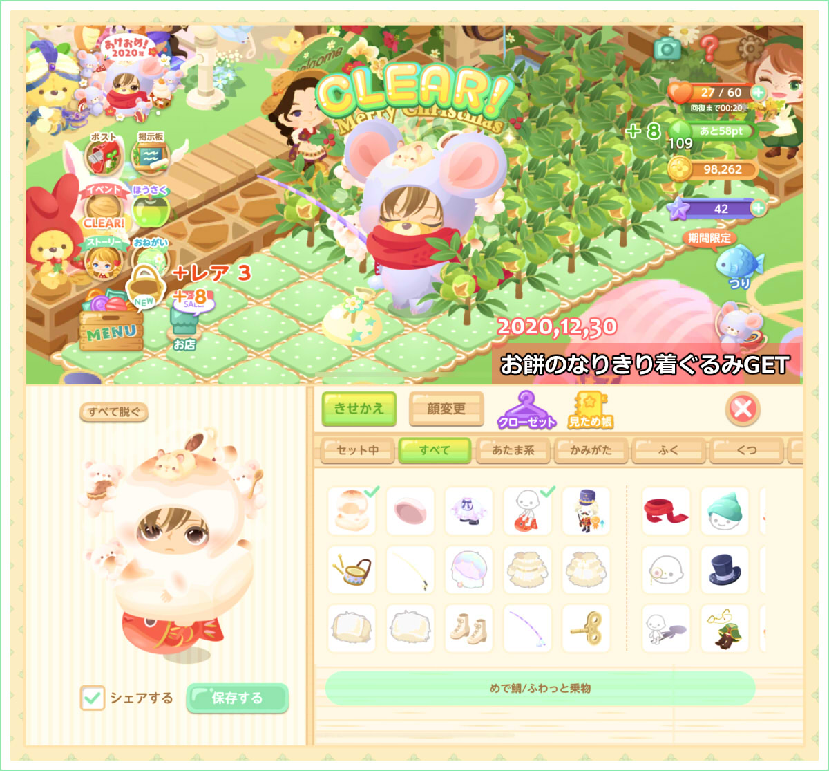 期間限定のスピカのおねがいクエストも無事にクリアしたので、“お餅のなりきり着ぐるみ”GETです。クエストの内容は、期間内に割れクルミを400個集めるというような内容だったと思います。400個ってなかなか多いと思って焦ったのですが、案外間に合うものですね。