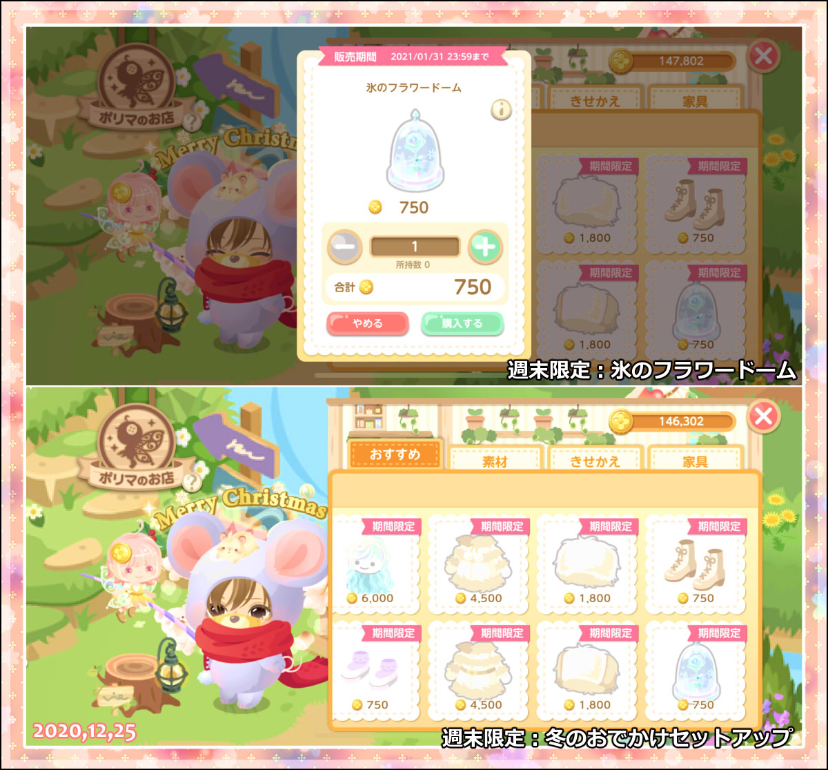週末限定アイテムの『氷のフラワードーム』『冬のおでかけセットアップ』。こちらは忘れずに購入。