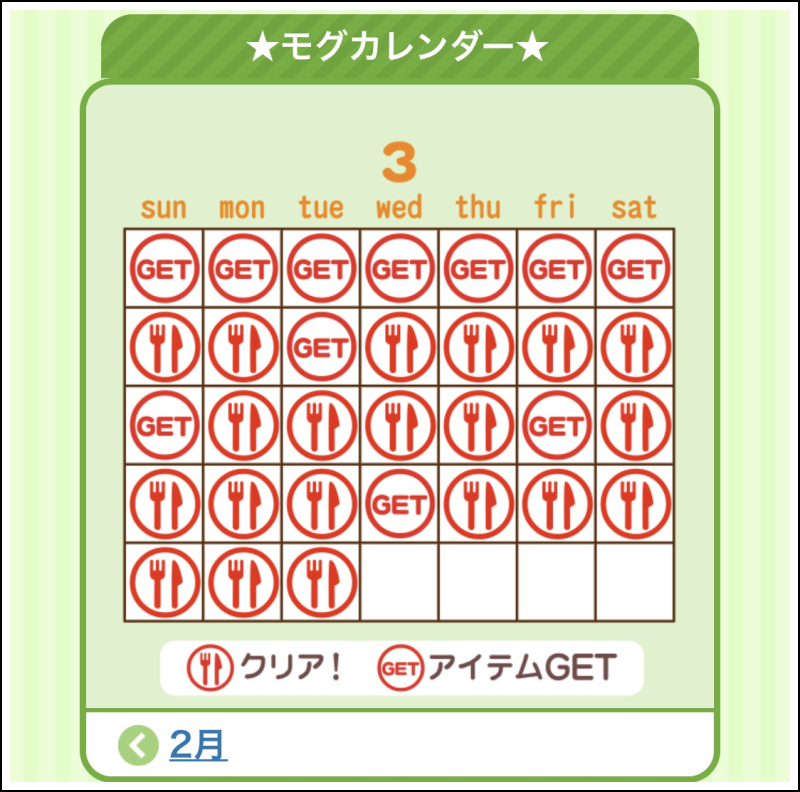 ピグライフと関係ないですが、モグもまだ続けていて3月のカレンダーが埋められたので載せておきます。日課みたいになってます。