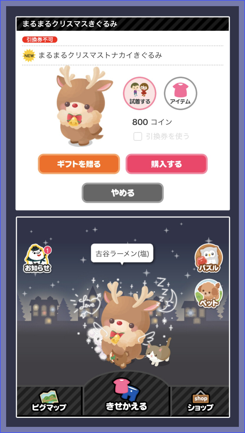 スマホ版のピグで可愛かったので思わず課金emojiして購入しました(;´-∀-`)emoji ピグパでも同じものがあったけどピグパは本垢から引き継いでいないので課金はしないつもりです。全身着ぐるみアイテムって初めて買いましたがコロコロしていて可愛いですね笑。雪だるまemojiも可愛くて欲しかったけどそんなに課金できないので諦めましたemoji トナカイは一目惚れですemoji