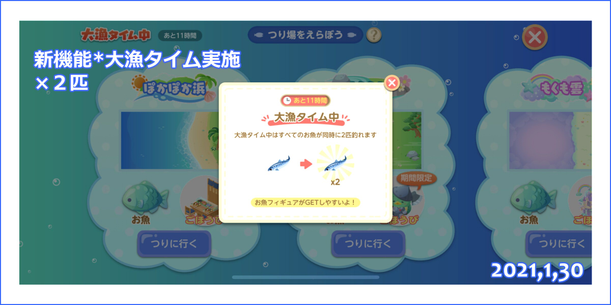 今回から始まった新機能『大漁タイム』は釣れるお魚が×2になっています。ただしイベントが始まる前に終了してしまったので大漁タイムの恩恵に与れることなく完走しました(;^ω^) 微妙にズレていたんですねぇ…。大漁タイムならもっと楽にクリアできたでしょうね。