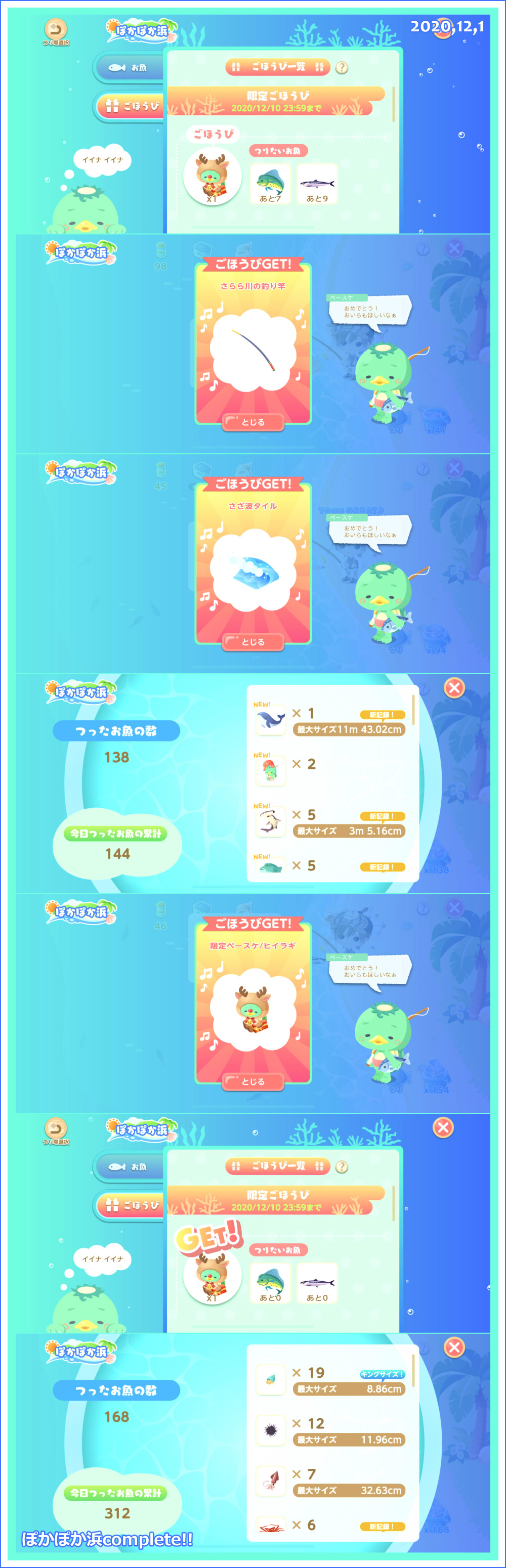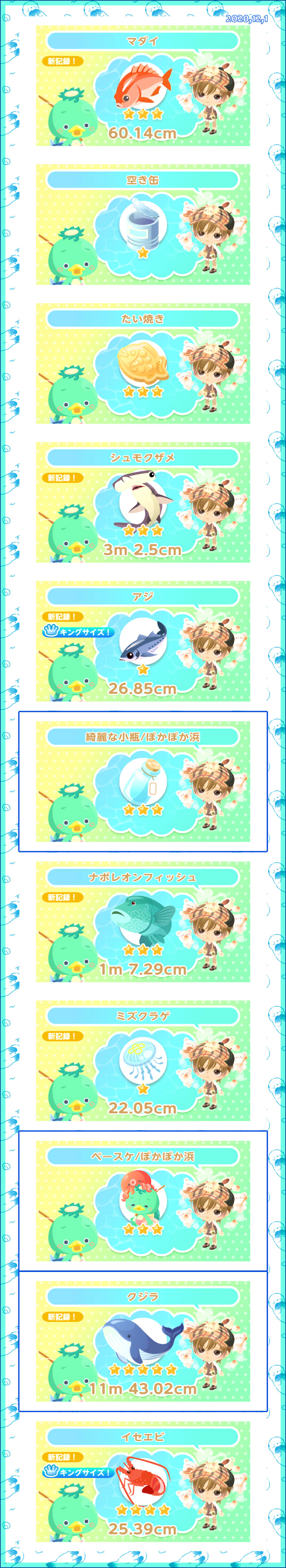 ペースケ*ぽかぽか浜、その他いろいろゲットできました。ぽかぽか浜で釣れるお魚は全てコンプリートできたようで、次のエリアの