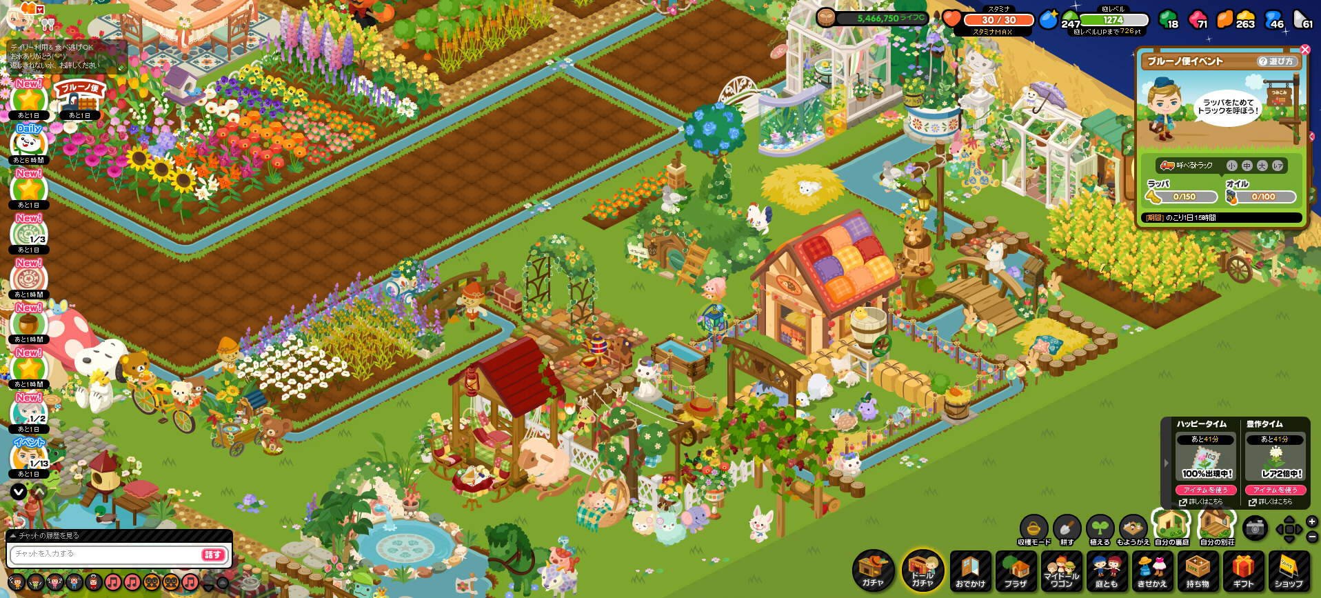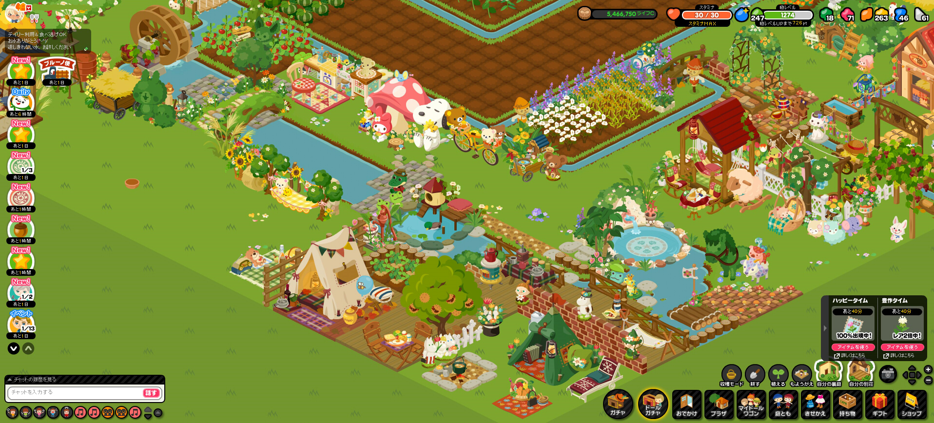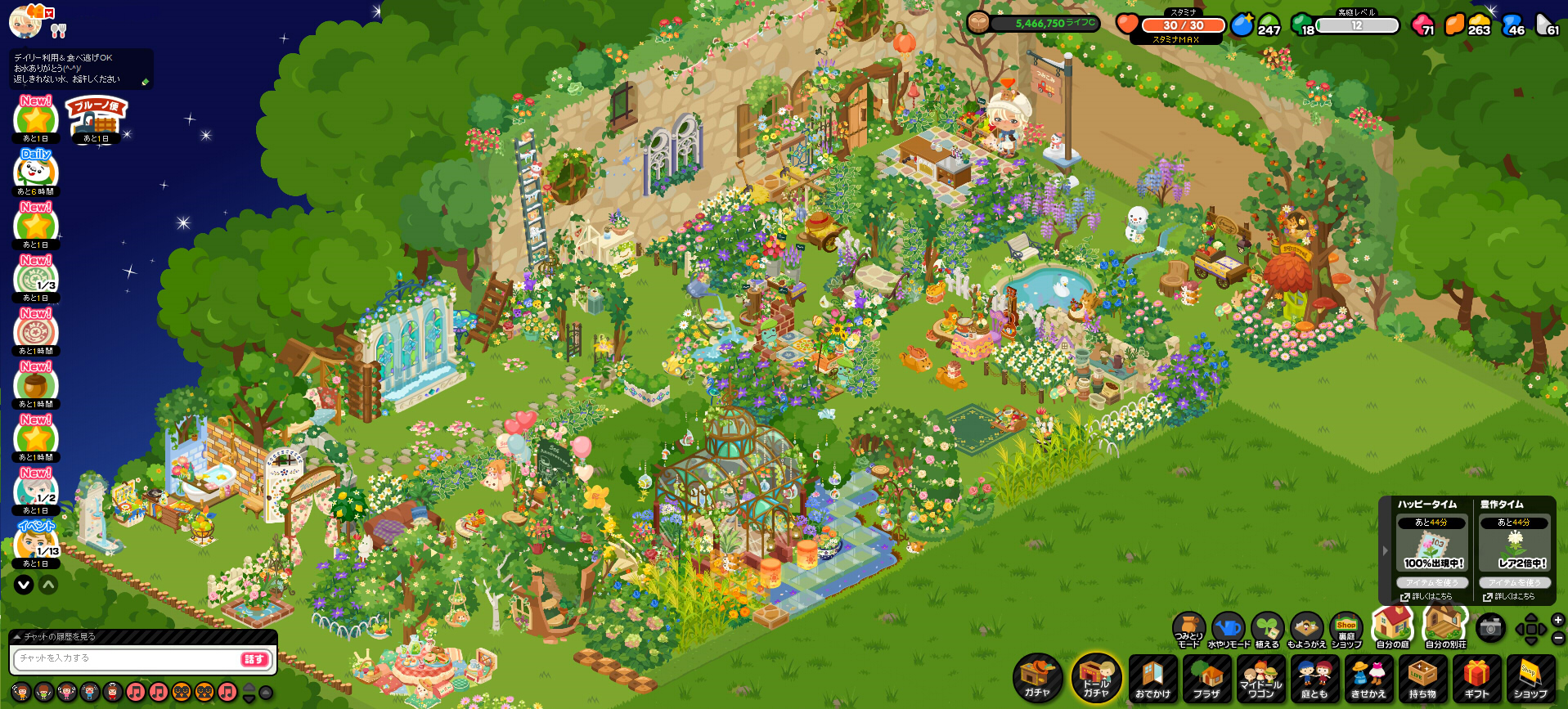 お庭にあまりログインしなくなってどれくらいが経ったか分かりませんが、2018年になってから、また少しづつログインするようになりました。2017年にもお庭の画像は少ないながらもちらほらあったと思いますが、かなり少なくなっているのが分かるかと思います。それだけログインする頻度が減ってきているんですよね・・・。イベントにはもう全くといって良いほど参加していません。以前ほどお庭にかける時間がなくなってしまったことが大きいです。他のソシャゲ(オペラオムニア)にハマったり、創作活動二次創作活動もやっているので、どうしても時間が割けなくなるんですよね。