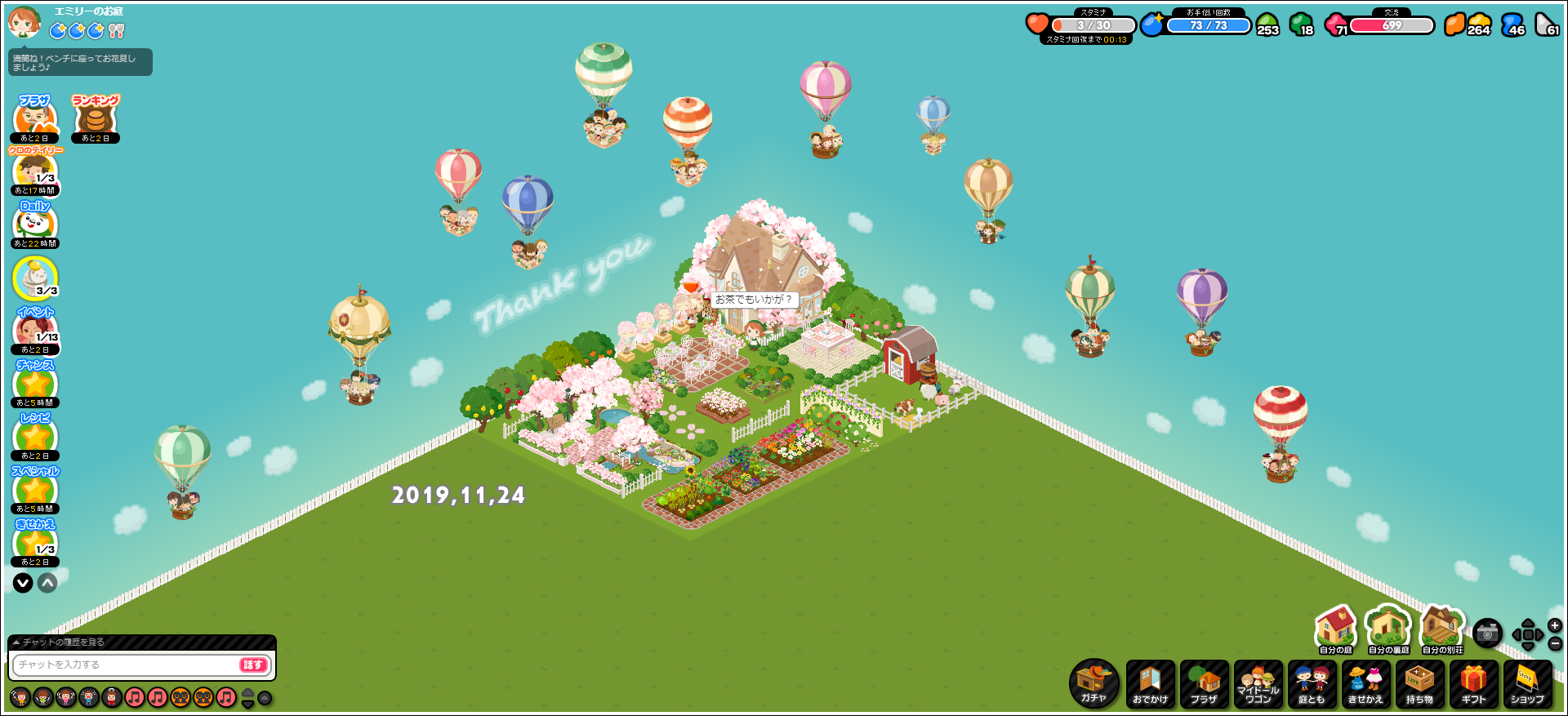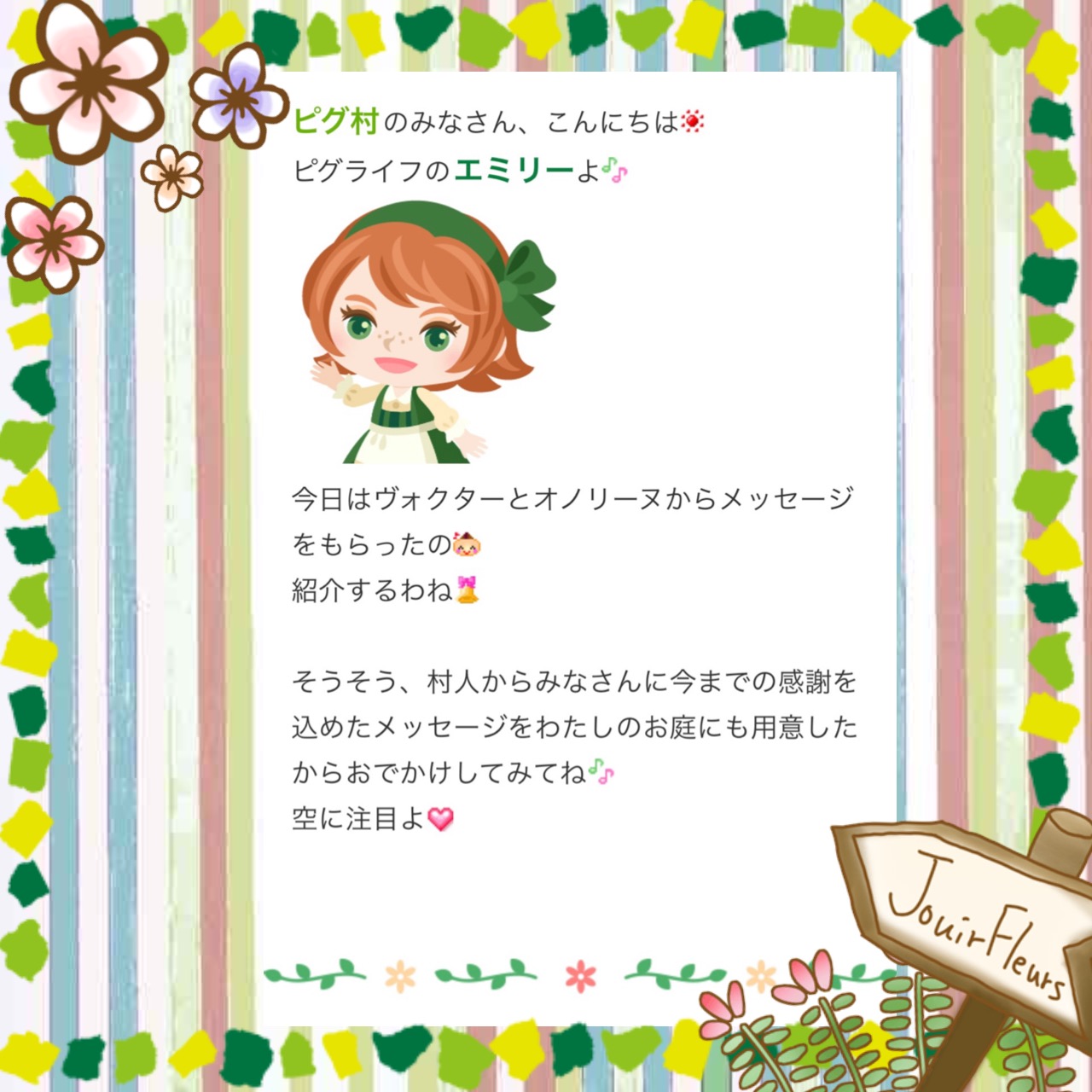 エミリーからピグライフユーザーへ向けてメッセージがあるということで、エミリーのお庭emojiemojiへ行ってみましたemoji ソメイヨシノemojiのイベントがライフ最後のイベントになるんですねぇ…。エミリーのお庭も桜が満開で気球emojiが飛んでいて。゚( ゚´д`゚ )゚。emoji 最後を飾るには桜のイベントで良かったのかも知れませんね。最初はどうしてクリスマスのイベントじゃないんだろうと少し不満があったのですが、桜emojiってemoji出会いと別れの象徴emojiだと思うので…(´;ω;`)