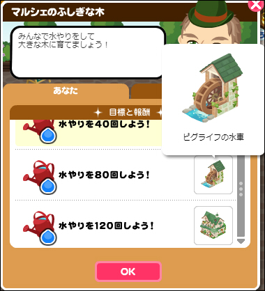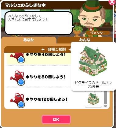 emojiそれから、ふしぎな木の水やりについてemoji これ最近になってようやく報酬があることに気が付いたんですよねemoji なのでサ終までに間に合いそうにもありません。゚(゚´ω`゚)゚。emoji 最後の報酬がまさか『ピグライフのドールハウス/外装』だったとは…。知っていたら毎日ログインして頑張って水やりしたんですけどね…(ノω;`)emoji まぁもう仕方がありません。スマホ版ピグライフで似たようなアイテムが報酬として実装されるのを待ちたいと思います!