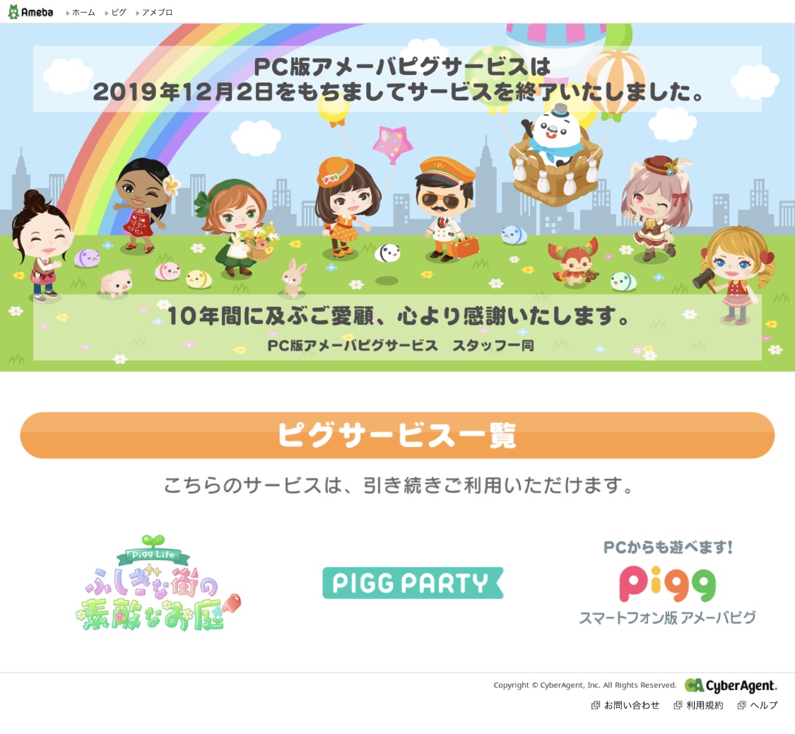 3月12日 - 公式ブログにて、パソコン版アメーバピグ、モバイル版アメーバピグをはじめ、その他系列ピグゲームが2019年12月2日15:00をもってサービスを終了することを発表。