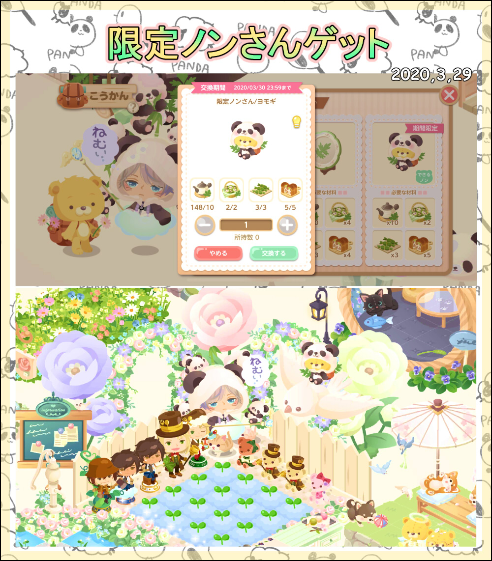 限定ノンさん(ヨモギ)もなんとかイベント期間内に手に入れることができました(;´∀`)emoji 今回はギリギリだったなぁ…。あとはお皿集めをのんびり頑張ります(`・ω・´) お皿集めはイベ期間外にもできますからね。