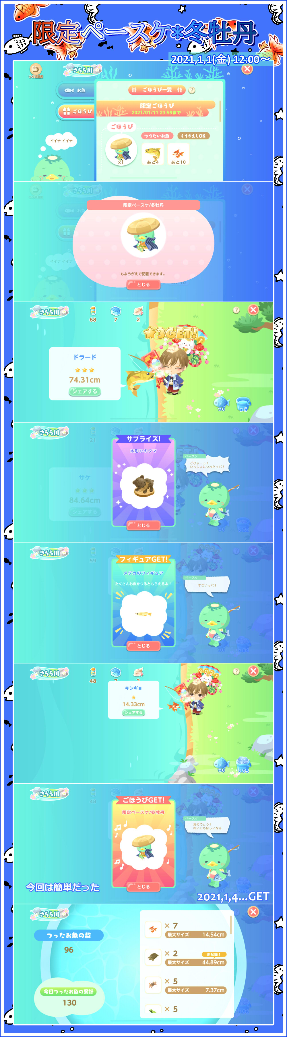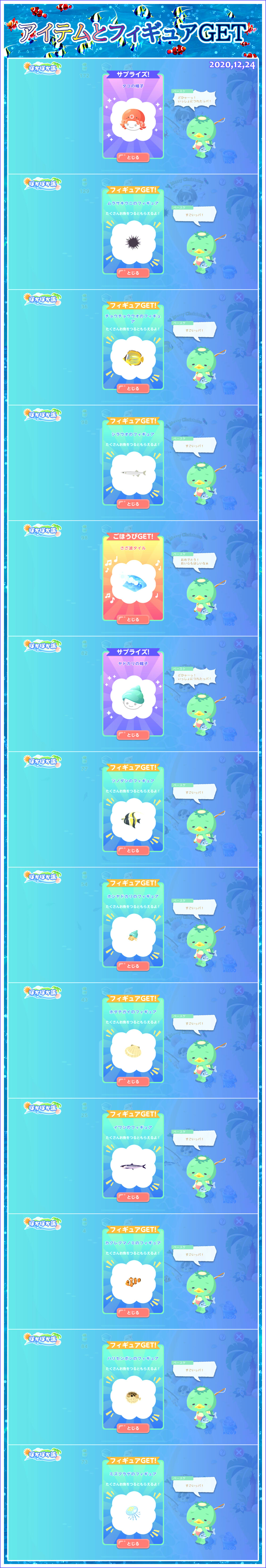 ナポレオンフィッシュを釣るのに手こずったお陰で、サプライズアイテムとフィギュアを大量にゲットすることができました。お魚フィギュア