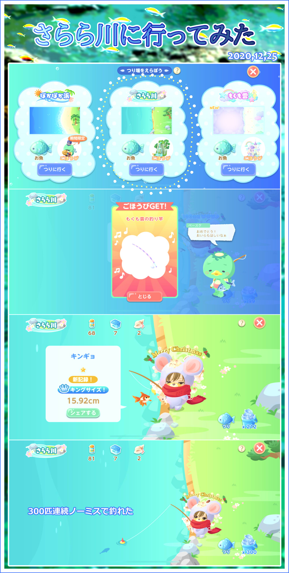 ヌシを釣らなくても『もくも雲』エリアまでは行けるようなので、次は『もくも雲』でお魚を100匹釣って“ぶくぶく洞窟の釣り竿”を入手したいと思います。