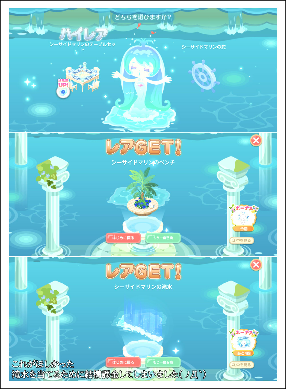 今回はかなり課金してしまいました。レアアイテムの滝水が欲しかったんですよねぇ…。これだけ出てくれればそれで良かったんですけど…欲しいものほど出ないですねぇ。かなり課金1400円くらい?してやっと出ました(;^ω^)emoji 最近レア、ハイレアが殆ど出ません。かなり回してやっと出るって感じですね。