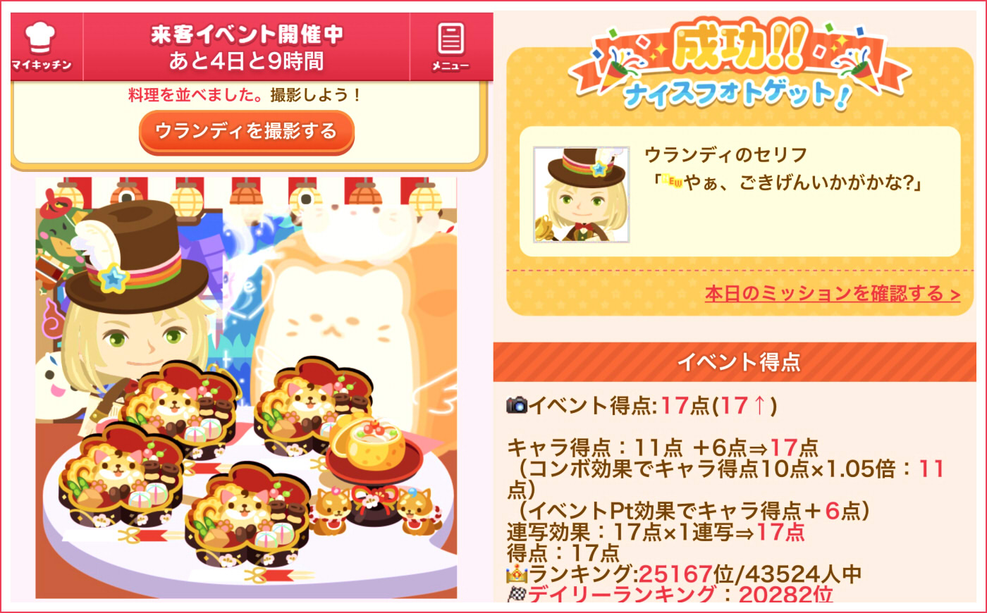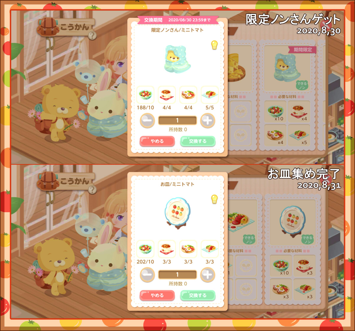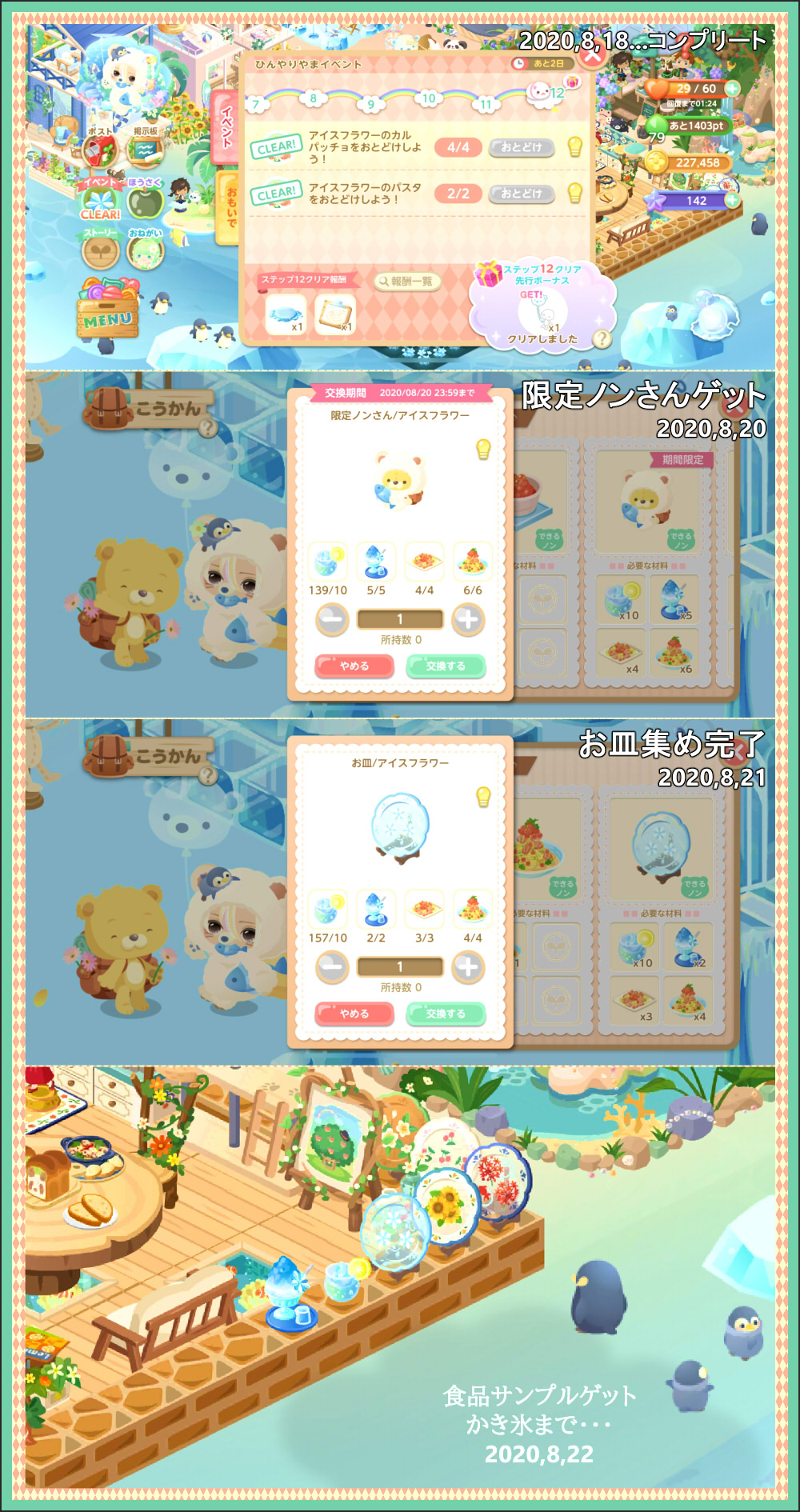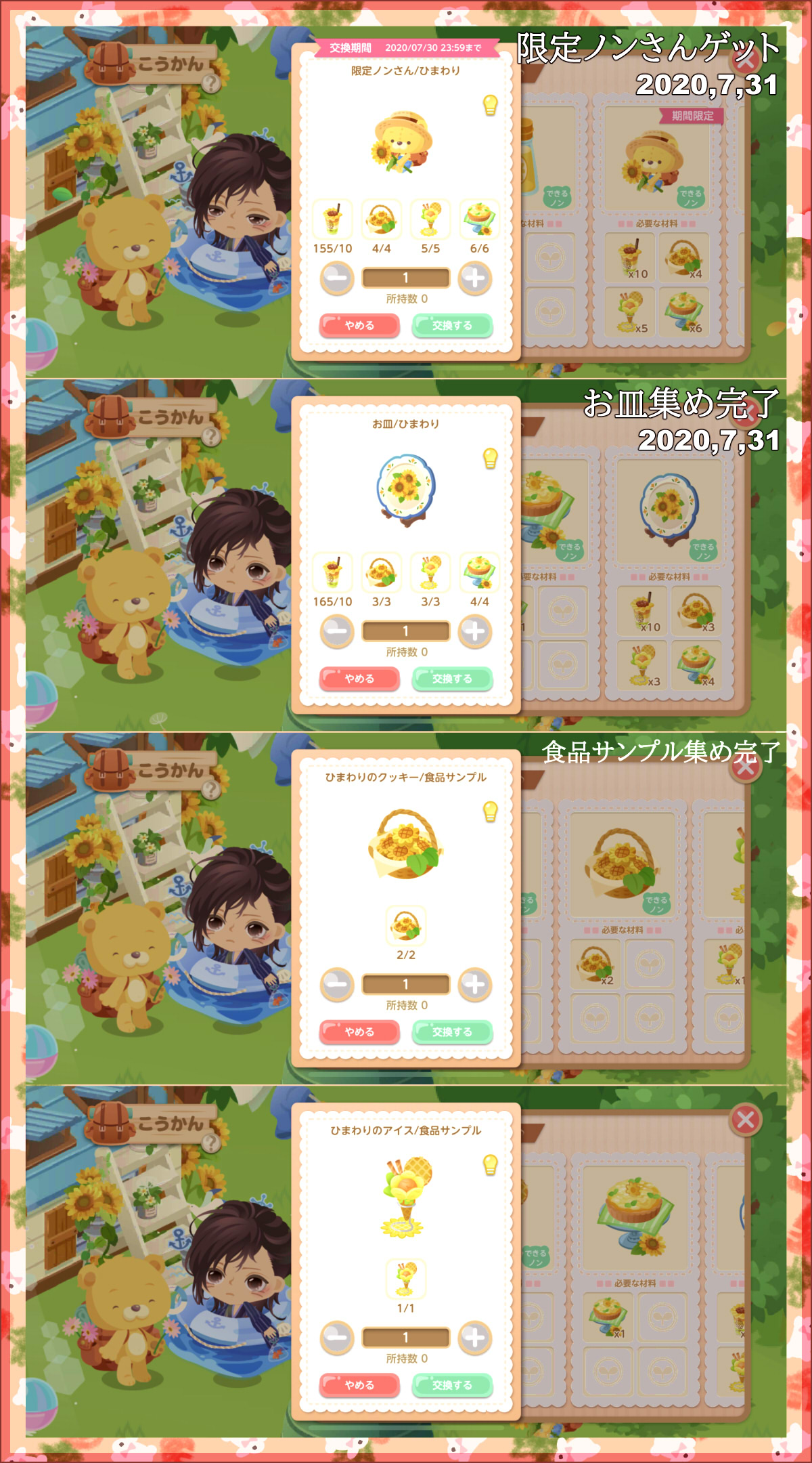 31日にマンゴーのお皿も交換できたので、後はブルーシエルのお皿を交換したらノーマルストーリーのお皿集めに移れます。ズレ始めたのってブルーシエルのイベントからなんですよね(;^ω^) 作る量を間違えたりgdgdしてしまったせいもあるけど、そもそも他のイベントに比べてお皿交換に必要な材料が多すぎるし。次のイベントはすぐ始まるしで…なかなかズレを修正できない(;^ω^)emoji あと少しなんですけどね。