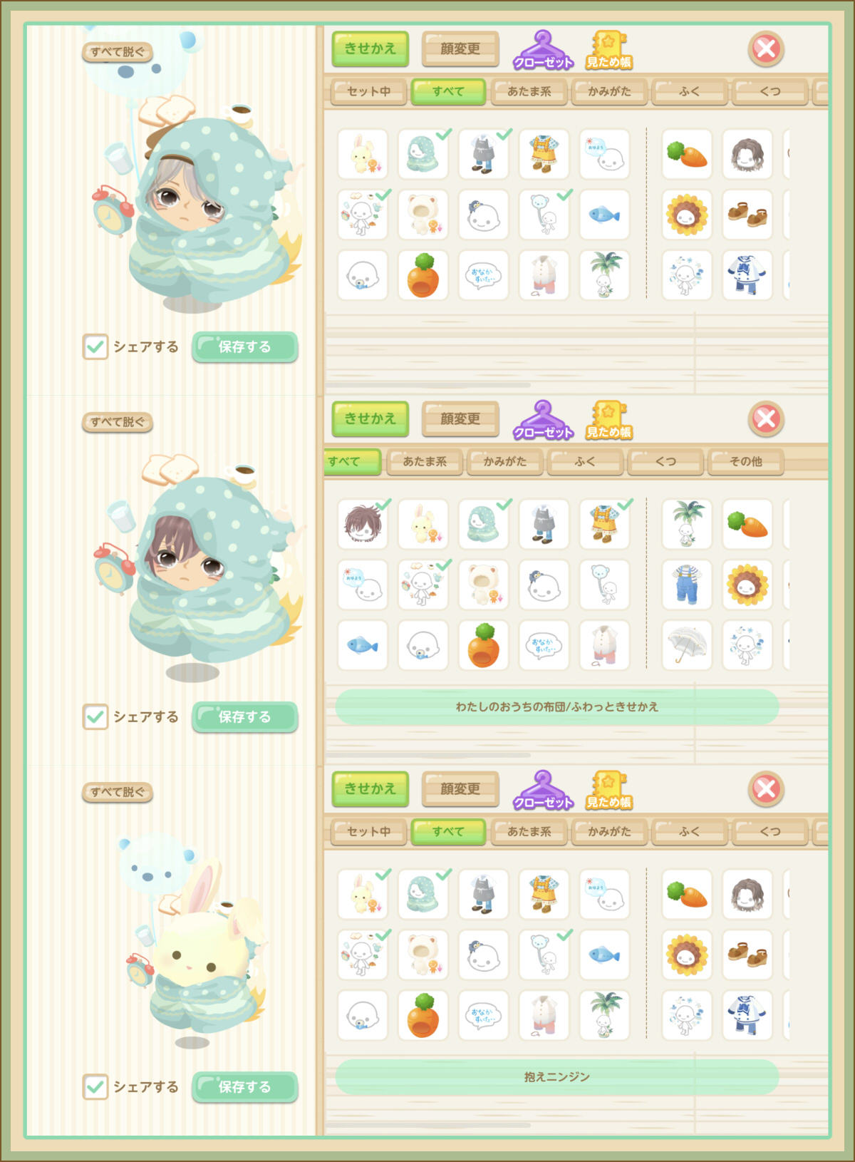 イベント3連続クリアを達成したので“ウサギのなりきり着ぐるみ”が貰えました~emoji 可愛い(*´ω`*) ちなみに風船emojiを持たせなくても、“わたしのおうちの布団(ふわっときせかえ)”を装備していると浮きます。布団でどうやって浮いているのかは謎w
